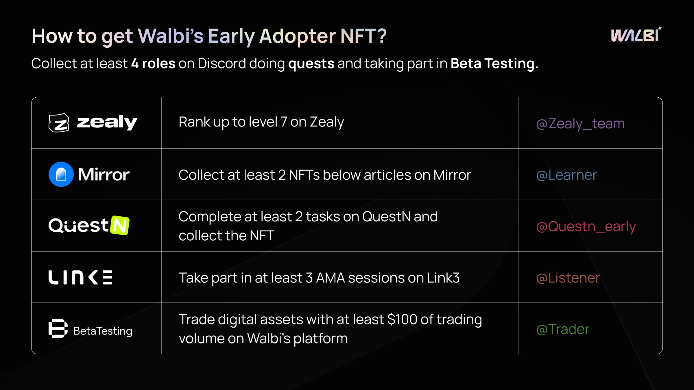 O Early Adopter NFT faz parte do nosso Programa de Recompensas Comunitárias, oferecendo vantagens incríveis aos participantes. Depois de conseguir quatro funções (@Zealy_team, @Learner, @Follower, @Quest_early), você receberá o Walbi Early Adopter NFT.
