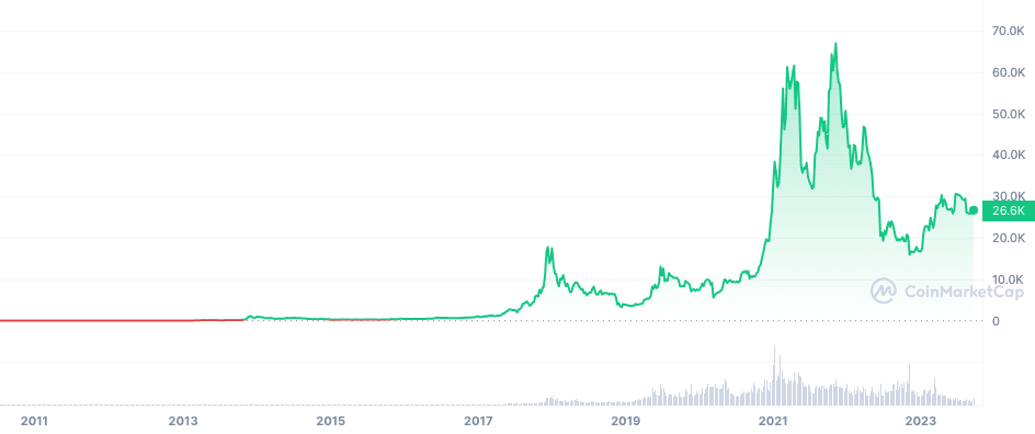 Cryptocurrencies have a huge growth potential, offering traders more significant possible returns than most stocks. The most well-known cryptocurrency that gained huge returns is Bitcoin (BTC). It launched in 2009, and in 2017 the digital currency reached a 1900% price increase. Now, the crypto is trading at almost $27,000 (at the time of writing).