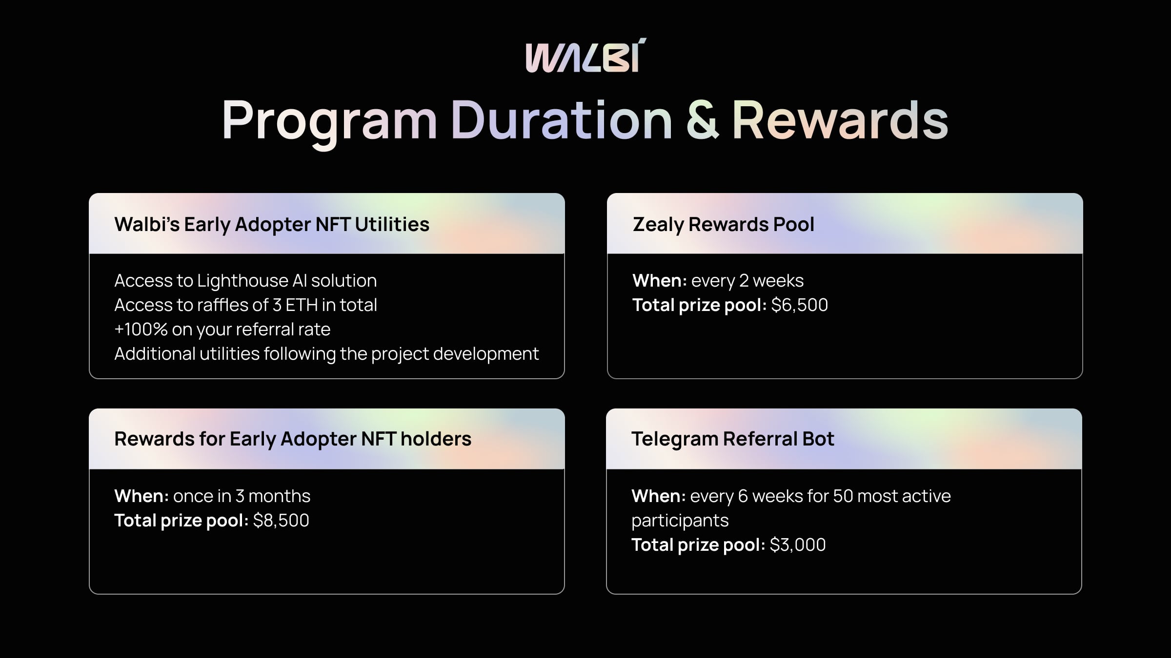 Além das funções do Discord e dos NFTs do Walbi Early Adopter, realizaremos sorteios adicionais para os participantes mais ativos do programa.