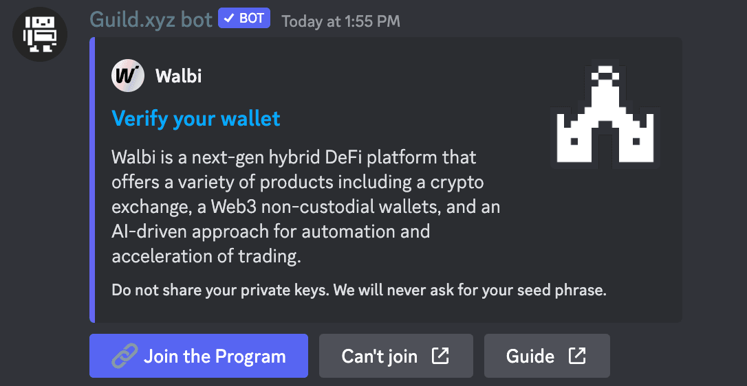 Junte-se ao nosso Discord e Guildae, em seguida, siga as instruções na Guilda página. O objetivo é coletar 4 funções no Discord, que concedem a você a função @Early_adopter e o Walbi Early Adopter NFT. A realização deste último oferece vários benefícios relacionados a serviços públicos e a chance de participar de sorteios exclusivos.