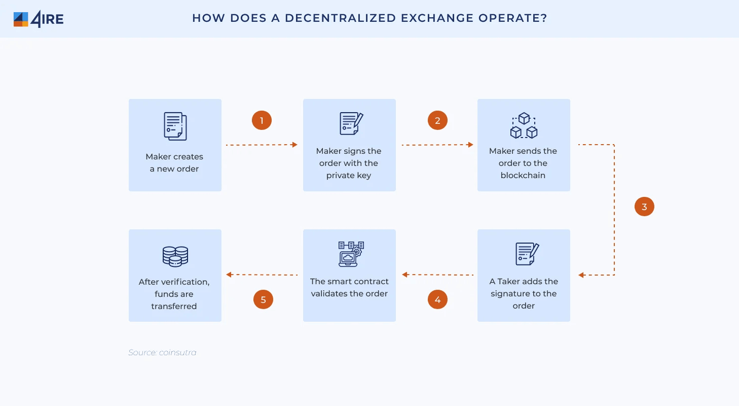 A ordem de negociação do usuário é transmitida para a rede DEX. Outros usuários na rede podem ver esse pedido e optar por preenchê-lo se ele corresponder aos seus critérios. O contrato inteligente do DEX combina as ordens de compra e venda. Eles têm regras predefinidas que os orientam. Essas regras geralmente usam a base do primeiro a chegar, primeiro a ser servido ou a prioridade de preço e hora. Se ocorrer uma ordem correspondente, o contrato inteligente prosseguirá com a execução da negociação. O contrato inteligente executa a negociação com antecedência. Isso transfere os ativos especificados do Criador para o Comprador. O contrato inteligente do DEX garante que ambas as partes cumpram sua parte. O blockchain atualiza os registros de propriedade dos ativos envolvidos. Isso acontece depois que a negociação é executada. Todo o processo está disponível no sistema blockchain. A gravação fornecerá um registro imutável e transparente da negociação. Os DEXs podem cobrar taxas para facilitar as negociações. Essas taxas geralmente são mais baixas do que as das bolsas centralizadas. Depois de uma negociação bem-sucedida, os usuários podem retirar seus novos ativos. Eles também têm a opção de deixá-los em sua carteira no DEX para futuras negociações.